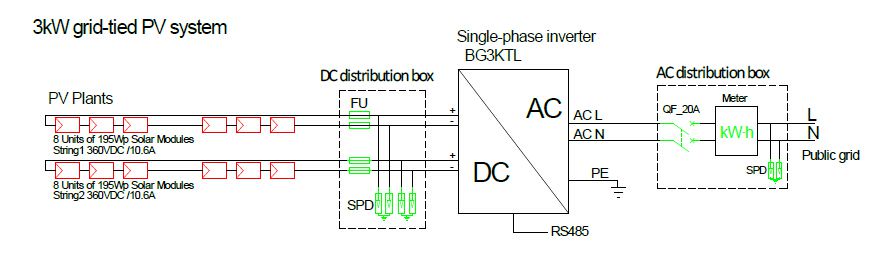 整套3kW光伏并网发电项目的太阳能电池组件安装在客户家中的屋顶上,逆变器产品及直流开光安装在屋檐底下比较醒目的位置,交流配电柜安装在室内,线路铺设以穿墙式敷设。系统采用了16块195Wp的单晶硅太阳能电池组件,8串2并倾斜安装在屋顶上。光伏并网逆变器采用是深圳英威腾的iMarsB系列3kW光伏并网逆变器。