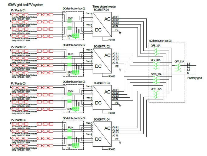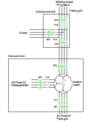 整个系统共用了280Wp的太阳能电池组件216块,英威腾15kW光伏并网逆变器共4台。4台逆变器输出汇流后并入工厂内部的电网,该电网通过厂内变压器接入公共电网,或者直接接入工厂的柴油发电机。厂区一般由公共电网供电,当电网停电时,切换至柴油发电机供电。柴油发电机启动一次大约工作2个小时,