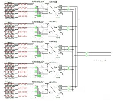 技术5台逆变器总的输出功率是100kW,每台逆变器有4路输入,每路输入由21块太阳能板串联而成,总的输入电压为728V,每路输入电流8.58A,总的输入电流为34.32A。4路直流电源经过直流配电箱后输入逆变器,逆变器逆变成交流后进入交流配电箱,5路交流电经过交流配电箱汇流后并入公共电网。