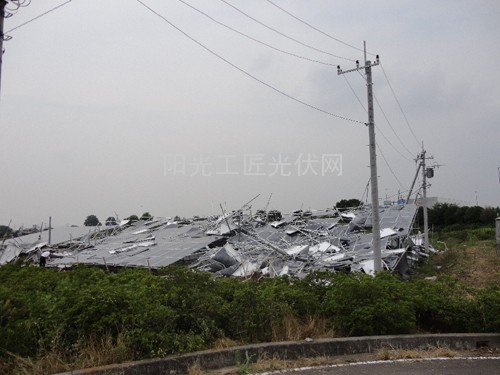 15日下午,伊势崎市内刮的是东北风,估计东北侧后列的2个阵列是背面遭遇强风,整个架台被从桩基上掀起吹飞,落到前排的阵列上,前排的阵列有一半被砸坏。
