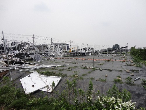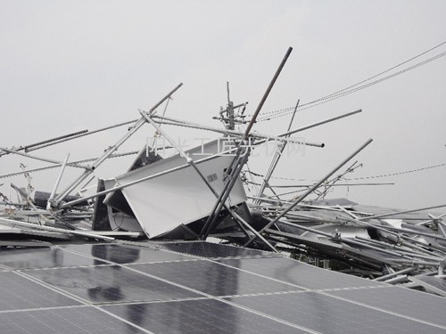 估计是在架台倒塌的过程中,电池板脱离架台的金属固定件被风刮飞。阵列下方设置的PCS(约10kW×5台)中,倒塌的阵列上装着的3台连同单管一起被吹飞了。