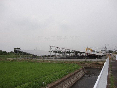 该电站电池板的设置方法为,将单管桩基打入地下1m左右,再用接头将单管与架台组装起来。阵列(电池板的设置单位)大致分5片,为南北2列设置。以约15度的角度设置了3个约230张(横23张×纵10张)和2个约340张(横34张×纵10张)电池板的大面积阵列。