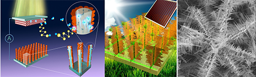 设计制备出由ITO纳米线芯层与Cu2S纳米晶壳层组装而成的ITO@Cu2S纳米线阵列,使用这种具有三维导电网络结构的材料制备的量子点敏化太阳能电池表现出优于传统材料的优异性能(Nano Lett., 2014, 14, 365);通过优选Cu2S纳米晶壳层的构筑方法,深入研究其组装结构中ITO纳米线芯层与Cu2S纳米晶壳层间界面对电池性能的影响,进一步提高了电池的转换效率(ACS Appl. Mater. Interfaces, 2014, 6, 15448);在此基础上,通过网络化多级组装设计,在ITO@Cu2S纳米线阵列结构基础上进行了二级和三级结构的组装,进一步使利用这种对电极材料的量子点敏化太阳能电池的转换效率提升至6%以上。这种新型对电极材料在电池运行时可有效形成隧道结,通过降低器件的串联电阻,提高并联电阻以及填充因子而大大提高了电池的转换效率,而且解决了传统金属铜/硫化亚铜易脱落、无法稳定工作的难题(Nano Lett., 2015, 15, 3088)。