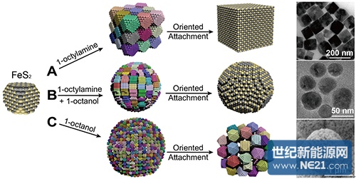 图2 溶剂诱导定向聚集生长不同形貌FeS2微纳米材料示意图