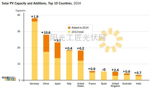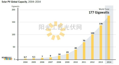 在可再生能源中,“光伏发电的增长率最令人吃惊,2004年设置量为3.7GW,而2014年达到了177GW,10年增长到了48倍”。2014年光伏发电增加量排名前三的国家依次为中国(10.6GW)、日本(9.7GW)和美国(6.2GW)。