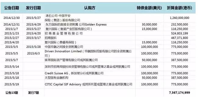 自2013年6月借壳上市以来,联合光伏公告了约16次可转债发行,尤其是在2015年,联合光伏至今共成功发行了至少7期可转债,融资额度约为33亿人民币。认购名单上包含了招商局银科、瑞信、复兴国际、华融国际等大名鼎鼎的投资机构。