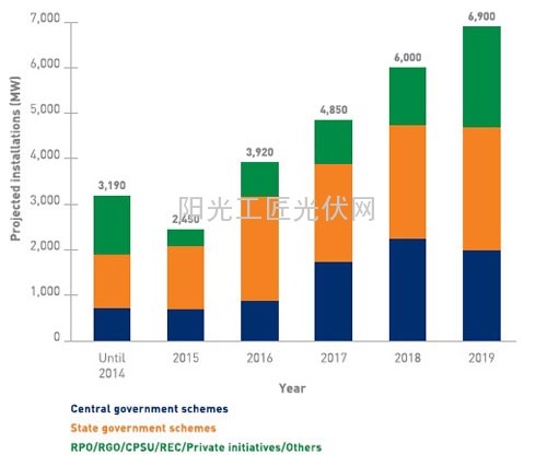 印度每年的光伏发电设备新设容量。预测2019年之前将增设24GW的光伏发电设备(出处:“India Solar Handbook, 2015”,BRIDGE TO INDIA)