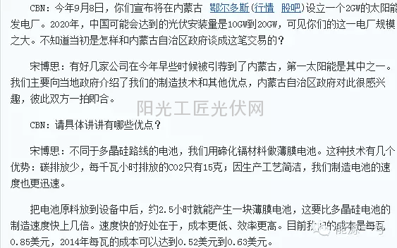 总裁宋博思曾说,当年作为好几家公司被引荐到内蒙古的企业之一,第一太阳能因为自己的制造技术和其他优点,令内蒙古自治区政府兴趣盎然,彼此一拍即合。但后来外界传说是电价谈不拢等原因有缘无分。中国光伏市场现在都已这么火热了,老美“唯有泪流数千行,醉对往事话凄凉。”