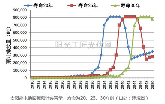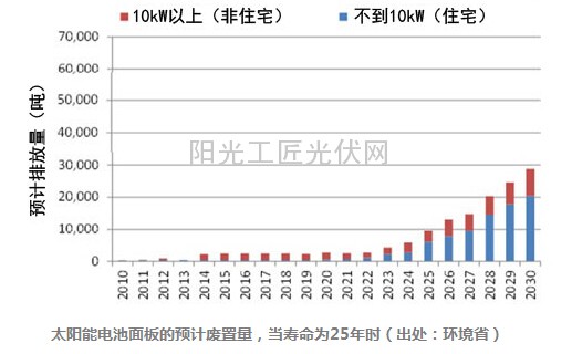 报告称,因固定价格收购制度(FIT)光伏发电设备激增的结果是,太阳能电池板的废置量,在寿命为25年的情况下,预计2020年度约为3000吨,2030年度约为3万吨,2040年度约为80万吨。
