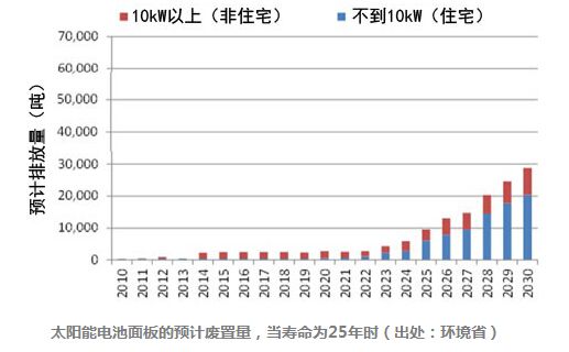 报告称,因固定价格收购制度(FIT)光伏发电设备激增的结果是,太阳能电池板的废置量,在寿命为25年的情况下,预计2020年度约为3000吨,2030年度约为3万吨,2040年度约为80万吨。