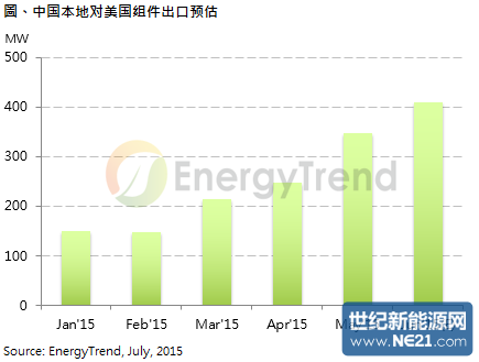 重审税率虽尚未定案,然一线垂直整合大厂成本下降进度符合预期,目前约落在US$0.45~0.47/watt之间,若按双反初判税率计算,美国组件价格维持在US$0.6/watt以上将能使中国厂商拥有极佳毛利,因此天合光能、晶科、阿特斯、英利等一线大厂仍能直销至美国。EnergyTrend预估,2015上半年由中国出口至美国的总量约达1.5GW。