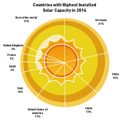 自2000年起,德国的可再生能源法刺激了太阳能产业迎来黄金发展期。其中最重要的一点,就是保障所有太阳能项目的电价能够以显著高于市场价格的水平出售给电网运营商。但是,随着中欧太阳能贸易摩擦愈演愈烈,就目前来看,德国仍然是世界上领先的太阳能市场。但是,较之10年前,德国的太阳能产业已经蒙上了一层阴影。统计显示,2014年,欧洲太阳能电池制造商的产能占全球的8%。但是,中国的产能占全球的64%。