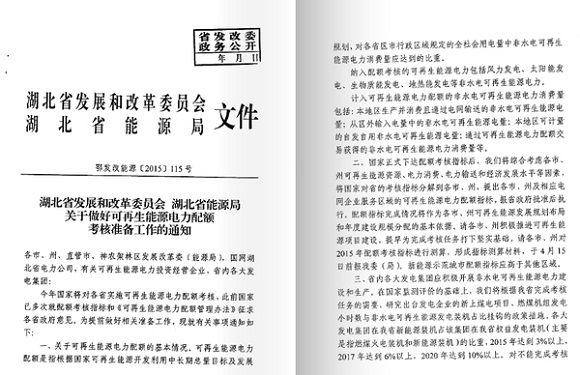 2015年3月31日,湖北省发改委和能源局联合下发《关于做好可再生能源电力配额考核准备工作的通知》;4月2日,内蒙古自治区也出台了类似的规定,要求全区2015年可再生能源上网电量占比达15%,到2020年达20%,其中风电和光伏限电率分别控制在15%和6%以内,成为首个省级可再生能源配额制。