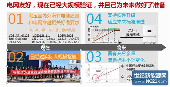 同时华为在设计产品之初,也考虑到未来电网标准越来越严苛,提前做了冗余设计以适应未来不断提升的标准。目前中国标准要求电压降为0的时候逆变器做到150毫秒不脱网,华为则提前具备了200毫秒不脱网的能力。针对未来的标准演进,我们的芯片和操作系统还支持进一步的软件升级与优化。软件可扩展、可自适应,未来即使电网有某些新的标准发生变化,我们也能通过软件的升级、在线调整。在电网友好性上,我们有权威认证机构在现场大规模检验的报告,满足国内外所有电能质量和电网穿越相关标准要求,而且在中利、黄河、山路、绿巨人等并网项目中,得到了大规模实际验证,我们的电网友好性是稳定和坚强的。并且已经为未来做好了充分准备。