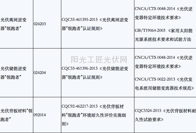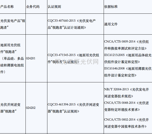为落实国家能源局、工信部、国家认监委《关于促进光伏先进技术产品应用和产业升级的意见》国能新能【2015】194号文件要求,实施光伏产品差别化的质量评价方法和管理要求,促进光伏产品市场准入标准的循环递进。中国质量认证中心(英文缩写CQC)发起光伏发电产品“领跑者”认证计划,围绕产品的效率、环境适应性及耐久性构建“领跑者”先进技术指标评价体系。本计划将通过严格的技术评价手段遴选出“领跑者”先进技术产品,支持我国光伏发电技术进步和产业升级。相关信息如下: