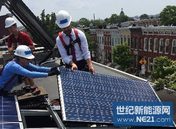 2015年7月7日,巴尔地摩市东部的联排住宅正在安装太阳能光伏板。(图片来源:白宫)