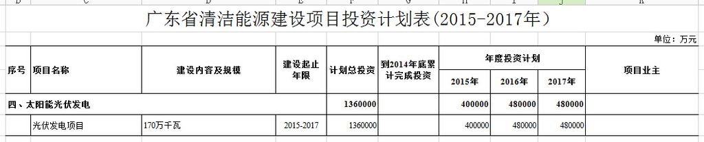 2.重点工程。2015年,推动阳东县大沟镇5万千瓦光伏电站项目、阳江印山南药基地光伏电站项目等地面光伏电站项目,中山格兰仕6万千瓦光伏发电等分布式光伏项目,以及佛山三水、广州从化、深圳前海国家分布式光伏应用示范区建设,年度新增建成光伏发电装机容量50万千瓦,新增投资40亿元。2016年,新增建成光伏发电装机容量60万千瓦,新增投资48亿元。2017年,新增建成光伏发电装机容量60万千瓦,新增投资48亿元。