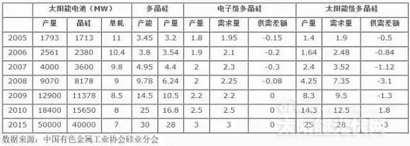 2005-2015年全球多晶硅供需平衡情况(单位:万吨)