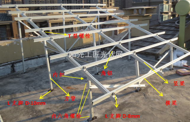 支架的设计需要了解常用的导轨型号和配件,如图5为混凝土屋面所采用的比较常见的支架架构(方阵由2*4片组件组成),由横梁、竖梁、方管、角铝、L支脚、T型螺栓和内六角螺栓、内扣连接件、压块等配件组成,深化设计需要确定各个配件型号、尺寸和数量。内扣连接件用于连接方管和竖梁,并且可调节角度。竖梁和横梁之间的固定采用L支脚加上M8的T型螺栓,方管和屋面的固定采用膨胀螺栓和L支脚,角铝的作用用于斜支撑加强固定。