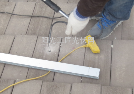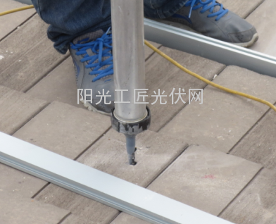 项目现场施工的一般流程为由业主购买支架、组件、逆变器等设备材料并提前进场,施工当天的工作有组件支架的吊装和搭建、组件安装、组串接线和电缆走线、组件防雷接地、逆变器和交流配电箱安装等,需要配齐专业施工工具和安全防范工具,如吊装绳索、钢管气筒、密封胶灌注专用工具、角磨机、电锤、手电钻、锯子、铁锤、内六角、套筒、美工刀、活动扳手、尖嘴钳、剥线钳、压线钳、扎带、起子、插线板、万用表、安全手套等等。如图6至图9为瓦面屋顶从打孔到导轨安装的施工过程,根据屋面实际情况和组件排布数量,膨胀螺栓安装孔位的前后间距约1米左右,由于混凝土瓦面有一定厚度,瓦面和保温层有几厘米的距离,再打入现浇层后,总共深度约15cm左右,孔位开好之后需要将多余的混凝土土灰用钢管气筒清除干净,灌注硅胶需要见到明显的溢出为佳,膨胀螺栓和L支脚搭配好之后敲入孔内,横梁和L支脚固定,最后在安装孔位四周涂上防水胶,待半干燥后即可安装光伏组件,参考图10。