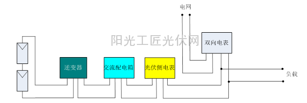 项目施工完成后需要等供电局并网接入,其中电表的接线方法根据不同地区也有两种方法,第一种接法如图11,因为很多家庭用户不会看逆变器,所以需要在交流配电箱输出端装一块计量光伏发电电量的电表。原用户电表改成双向电表,光伏侧电表的出线端接到该双向电表的出线端,用于显示用户自己用电和卖到电网的电量,多余的电反转计量。