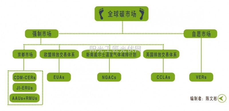 碳市场是碳交易活动及其所需支持环境的集合和载体,是由包括交易主体、交易产品、交易流程、交易活动及监管活动等在内的核心要素所组成的规则化体系。全球碳市场(如下图 2所示)主要分强制(减排)市场与自愿(减排)市场二种,其中强排市场主要有有京都市场、欧盟排放交易体系下的碳交易市场、新南威尔士温室气体减排计划下的碳交易市场以及英国排放交易体系下的碳交易市场等,自愿市场主要以清洁发展机制(CDM)体系之外的自愿减排量VERs减排类型为主的交易市场,VERs项目按照联合国制定的CDM项目方法学来开发和实施,VERs碳交易市场遵守《京都议定书》建立相应的CERs碳市场规则。