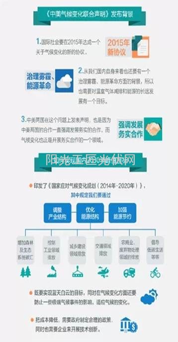 2014年11月12日,中美两国领导人正式发表了《中美气候变化联合声明》(如下所示),宣布了两国各自2020年后应对气候变化的行动目标:中国计划2030年左右二氧化碳排放达到峰值且将努力早日达峰,到2030年非化石能源占一次能源消费比重提高到20%左右;美国计划于2025年实现在2005年基础上减排26%至28%的全经济范围减排目标并将努力减排28%。同时,双方还确定了在低碳、环保、清洁能源等领域开展一系列合作项目。