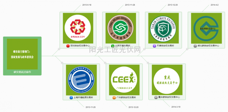 CCER项目是一种国家行为意识下的碳交易市场,是我国政府部门实施监管的交易市场机制。国家发改委于2012年6月13日印发《温室气体自愿减排交易管理暂行办法》-发改气候〔2012〕1668号(以下简称“管理办法“)中提出:为实现2020年单位国内生产总值二氧化碳排放下降目标,《国民经济和社会发展第十二个五年规划纲要》提出逐步建立碳排放交易市场,发挥市场机制在推动经济发展方式转变和经济结构调整方面的重要作用。对国内进行碳交易明确定义:将经备案的减排量称为“核证自愿减排量,即CEER。CEER经备案后,在国家登记簿登记并在备案的国内7省市试点(如下图 9所示)的交易机构内交易。