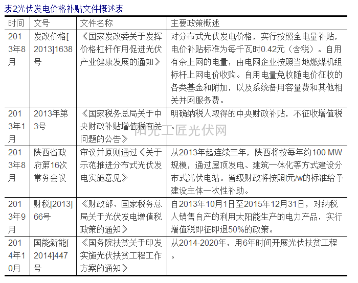 近年光伏发电价格补贴及税收优惠政策的主要文件见表2。