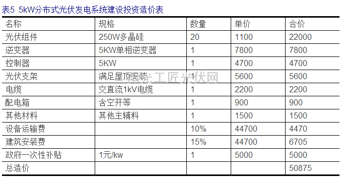 根据专业太阳能光伏发电解决方案服务商提供的数据,5kW项目造价费用如下表5: