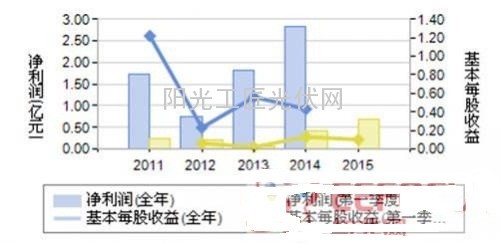 上图是阳光电源2011年以来的盈利情况,不能不说这种稳定递增的盈利图表是每个投资者都乐见的,其中2015年第一季度实现净利润0.69亿元(基本每股收益0.1元),比上年同期增长66.16%。