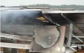 如果光伏方阵边框和线缆绝缘电阻过低,在长时间的高压大电流和高温高湿的使用环境下,容易造成绝缘层失效,导致电气短路和打弧。图2所示为汇流箱被火烧后的情形,可见,汇流箱及内部器件全部损坏,顶部组件也因高温产生形变。此案例发生在早上6点左右,事后进行检查时,发现原因是由于早上气温较低,组件运行在较低气温的环境下时,输出电压较大,汇流箱内部平衡器件在高压的情况下被击穿,正负极短路,并导致器件通过电流过大,进而引发火灾。