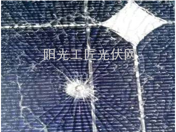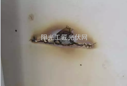 图3至图10展示的是光伏方阵场可能存在的安全质量问题。其中,图3、图4所示为组件被局部遮挡,图5展示的是组件被踩踏,这三种情况均可能导致组件产生热斑效应,严重情况下会引起组件背板烧穿(如图6所示),进而引发火灾。