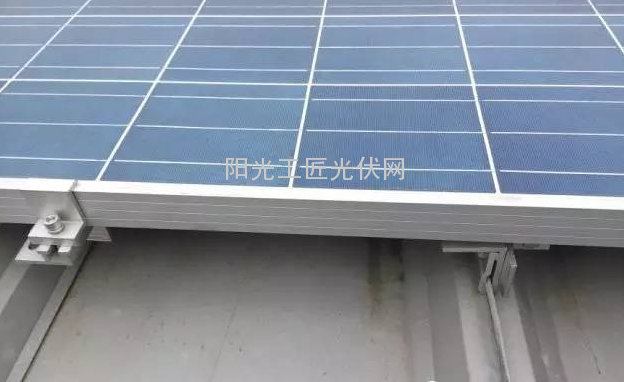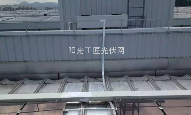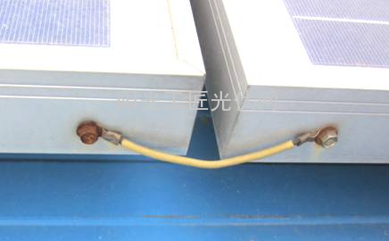 目前,国内对光伏电站的防雷接地措施尚无明确的设计要求,特别是无标准规定光伏电站的防雷接地是否必须采用独立接地的方式。为降低成本,国内已建设的分布式光伏电站仅有少数进行了独立接地,其余大部分与建筑物共用防雷接地系统。共用防雷接地系统的项目中,一部分将组件边框与支架连接,再与屋顶原有的接地系统连通(图21),这样光伏组件本身作为防雷的接闪器,圆钢/扁钢为引下线,一般认为只要各部分电气连接良好,也可达到较好的防雷接地效果;而另一部分彩钢瓦屋顶电站则本身没有引下线,光伏系统也不额外安装引下线,直接用压具将组件边框与彩钢瓦固定,从而与金属屋面连通(图22),这种安装方式极易受压具与彩钢瓦屋顶接触质量的影响,导致接地连续性电阻值偏高。