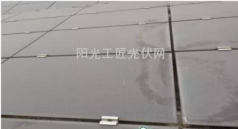 图7展示的是光伏组件表面大量积灰,这是由于未进行有效的运维,导致灰尘大量堆积,将严重影响电站的发电性能;图8同样展示的是组件表面被灰尘等物质覆盖,但该现象是由于方阵场受周围排出物污染。