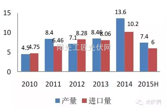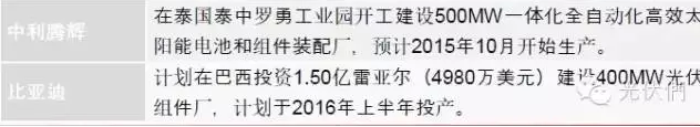 ˉ 截止2015年上半年,据不完全统计,我国已建成投产海外电池与组件产能分别达到800MW与1.5GW,在建及扩建产能分别达到3.2GW与3GW;
