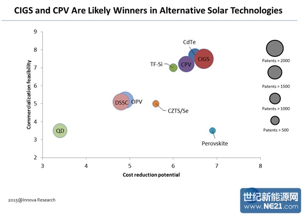 另外,此报告还从成本减少潜力、大规模商业应用潜力、行业并购等不同的角度对上面提到的新的太阳能技术进行全面的评估。Innova Research研究总监吴颖兰博士指出:“薄膜太阳能和聚光太阳能已经做好了大规模商业应用的准备,而第三代太阳能技术离大规模商业应用目标还有比较长的距离。在所有的新太阳能技术中,我们相信CIGS薄膜太阳能和高聚光光伏(HCPV)会成为新太阳能技术的赢家,这主要得益于这两项技术的优秀的成本下降和大规模商业应用潜力。”