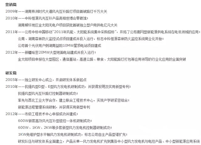 “我们是风能与太阳能中小型综合应用系统整体解决方案提供商和核心零部件供应商。目前已在湖南益阳、怀化及内蒙古包头分别建立了一个生产基地、一个售后服务中心和一个备用生产基地。”其实公司的网站内容写的还是有些复杂,它近年来做了一些电站EPC项目,而这家公司最初好像是做路灯的。