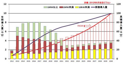 JPEA于2013年12月发行了“JPEA PV Outlook 2030”,提出了“2030年日本的光伏发电累计导入量目标为100GW”。2015年4月又出了其姊妹篇,将2013年版中2020年日本的累计导入量49.4GW的预测上调到了65.7GW。