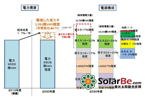 保证“光伏比例达到7.0%”的发电量约为749亿kWh,换算成设备容量约为64GW。发电量之所以约为749亿kWh的原因,是先确定了固定价格收购制度(FIT)的税款总额为2.3万亿日元,导入量是以此为上限确定的。