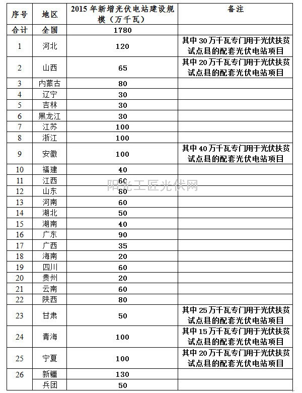 2015年国家能源局下达的装机目标:26个省区共17.8GW