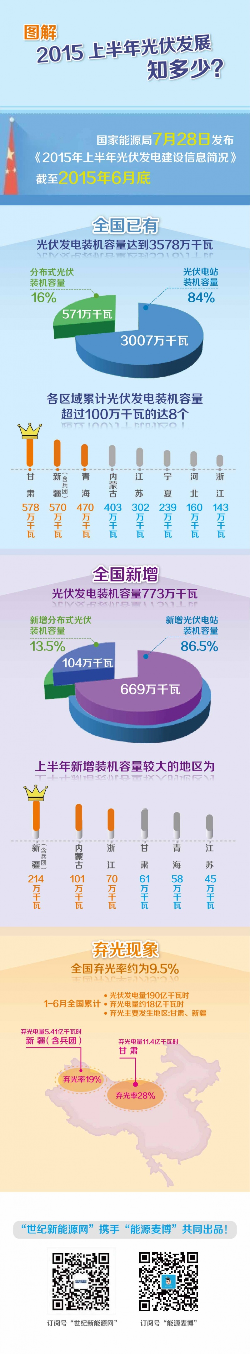 索比光伏网讯:根据国家能源局最新权威数据统计显示:截至2015年6月底,全国光伏发电装机容量达到3578万千瓦,其中,光伏电站3007万千瓦,分布式光伏571万千瓦。1-6月全国新增光伏发电装机容量773万千瓦,其中,新增光伏电站装机容量669万千瓦,新增分布式光伏装机容量104万千瓦。1-6月全国累计光伏发电量190亿千瓦时,弃光电量约18亿千瓦时,主要发生在甘肃和新疆地区,其中,甘肃省弃光电量11.4亿千瓦时,弃光率28%;新疆(含兵团)弃光电量5.41亿千瓦时,弃光率19%。
