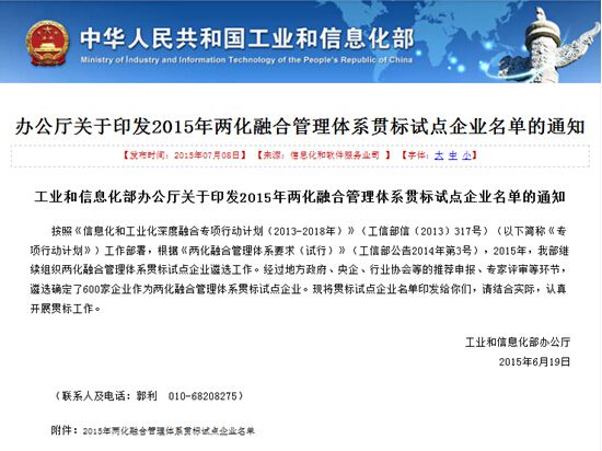 索比光伏网讯:近日,国家工业和信息化部公布了第二批共600家两化融合管理体系贯标试点企业名单,中利腾晖名列其中。截至目前,常熟市共有三家企业入围工信部试点企业,中利腾晖是常熟唯一一家入围的新能源企业,这标志着中利腾晖两化融合管理工作取得了阶段性的成果。