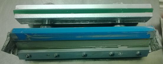 2.探求匹配的网版浆料与刮条:栅线印刷的理想效果是取得较大的高宽比,即栅线既高又细,这需要网版与浆料有效配合。之前存在一种现象是为降低印刷重量,一味降低网版线宽,而搭配的浆料较黏,频繁出现断栅和虚印现象,而部分虚印电池片在正面垂直检验时又很难发现,极易漏检。实验前使用的网版为400目18膜厚37线径,现优化为360目16um膜厚37线径网版,过墨性提高,浆料固定为杜邦18H,配以合适的丝印参数及产线的有效监控,明显地改善了丝印外观质量。同时由于之前使用的条形刮条易磨损,且要6小时更换一次,现引进一种新型刮条,由于接触面大,耐磨损,不仅降低了断栅、虚印产生几率,并且其寿命为一般刮条的10倍左右,如图3,上方为常规条形刮条,下方为改用的板式刮条。