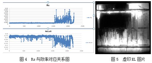4.通过效率测试程序卡控Rs来监控印刷异常:Rs主要包含四部分,硅片的体电阻,薄层电阻,金属电极电阻,欧姆接触电阻。正常多晶电池片的Rs值在2.50毫欧姆左右,可以在程序中设置将Rs大于一定值(建议3.5毫欧姆)的分选到某个档位,这样通过对该档位的比例监控即可快速预警虚印等异常问题。Rs偏大通常有以下表现情况:1.若发现某个时间段开始,整体偏大或间断性出现Rs偏大,很可能是因为印刷效果不好造成栅线和硅片没有形成合金层,有空隙导致欧姆接触不好。2.伴随开路电压和短路电流偏低的Rs偏大,可能为烧结原因造成,而伴随开路电压和短路电流偏高的Rs偏大,可能为方块电阻偏高。一般前制程比较稳定,若某段时间连续出现Rs偏高的一般均为EL虚印造成,图4和5显示了一段时间Rs偏高,效率下降,测试对应电池片EL图片虚印严重。