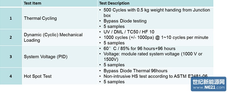 TUV莱茵对 Prism Solar 的产品测试在位于亚利桑那州坦佩的 TUV Rheinland PTL 进行,并对其组件在各种各样的条件下进行了测试。所有的组件在加速环境老化测试之前独立分组,且通过视觉检查和性能测试,以及绝缘和“湿漏电”测试。分组后,一些组件进行了热循环测试 -- 在 Q+ 标准下进行500次循环,相比之下,原标准 IEC61215 只有200次循环。其它组件也进行了一系列的试验,包括机械载荷试验和湿冻循环,还有一部分组件进行了热斑测试 -- 组件上某块电池片被部分遮盖时,没被遮盖的电池片的电力输出会造成组件局部过热。经过分组的不同测试,所有的组件都通过了最后的安全和性能测试。 该测试主要包含内容请参见附表,测试周期近 200天。 经过数千小时,Prism Solar 的组件通过 TUV 莱茵“Qualification Plus”全系列测试;其产品最终可以得到 Q+TUVRD -- 最新行业公认的标准和认证的标记。Prism Solar 成为第一家获得 TUV Rheinland PTL 认证,符合“Qualification Plus”(简称“Q+”)标准的光伏组件生产商。