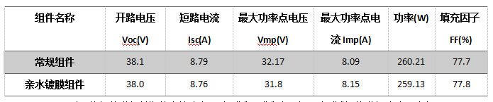 实验选取两块初始功率相同的光伏组件,其中一块组件玻璃表面使用了亲水镀膜技术,另一块组件使用的是常规的钢化玻璃。两块组件的初始电性能参数如下。