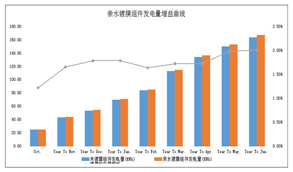 对两块组件进行长期的户外功率跟踪测试,测试过程中不对测试组件进行清洗,对比两块组件的发电量,得出如下亲水镀膜组件相对常规组件的功率增益曲线。综合不同季节的发电量测试数据,亲水镀膜组件相对于常规组件的发电量增益均值为2%。