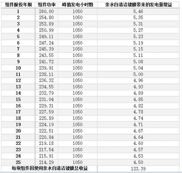 以一块初始功率为260W的组件为例,按照华东地区¥1每度的上网电价,每年1050小时的有效峰瓦小时数计算,则因使用亲水镀膜每年带来的经济效益为:0.26X1050X1X2%=¥5.46。