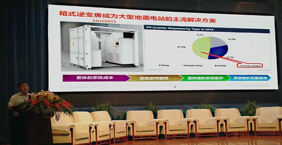 在随后的“西部光伏电站建设发展论坛”主题演讲环节,阳光电源系统解决方案总监张显立发表了“西部光伏电站发展方向及解决方案“的演讲,分别与参会嘉宾分享了”西部电站发展前景“、”西部电站面临的挑战“及”西部电站解决方案“。张显立表示,箱式逆变房是西部大型地面电站的主流解决方案;在组串式逆变器的应用方案中,40kW及更大功率的组串式逆变器将成为主流。